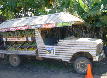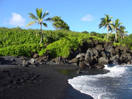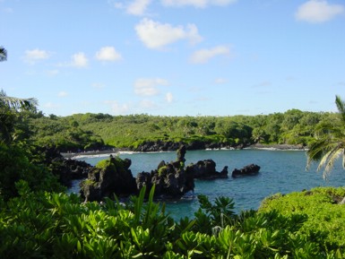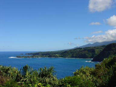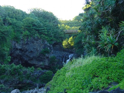 Die Straße ist eigentlich sehr schön zu fahren, wenn man sich Zeit nimmt. Rasant fahren kann man hier eh nicht, die nächste Haarnadelkurve kommt gleich um die nächste Ecke. Wenn man allerdings einen etwas überängstlichen Fahrer vor sich hat, kann man nur hoffen, das der das mit den Ausweichbuchten entlang der Straße verstanden hat und einen irgendwann mal vorbeilässt. Entlang der Strecke bieten sich etliche Abzweige und Rastplätze an es etwas gemütlicher angehen zu lassen. Die Landschaft ist einmalig. Alleine auf den ersten Kilometern haben wir soviel sattes grün gesehen, wie auf ganz Big Island nicht. Lohenswerte Abstecher waren für uns die Abzweige nach Wailua, eine Minisiedlung an der Küste und später zum Waianapanapa State Park mit seinem Black Sand Beach. Später in Hana haben wir uns den Ort ein wenig angesehen und sind dann weiter (denn die Straße ist ja hier nicht zu Ende) mit Endziel "Seven Sacred Pools" aus dem Ort wieder raus. Ab hier wird die Straße noch ein wenig enger und verwinkelter und irgendwie war ich dann doch froh als wir auf den Parkplatz standen und heil angekommen waren. Diese "Seven Sacred Pools" sind übrigens mehr als sieben und auch irgendwie überhaupt nicht heilig. Was jedoch stimmt ist, das der Fluss, der aus den Bergen kommt, über etliche Terrassen führt, die viele natürlich Pools bilden, bevor das Wasser ins Meer fließt. Zu den untersten 3 Becken kann man von Parkplatz bequem hinwandern und eventuell, wer's mag, noch ein erfrischendes Bad nehmen.