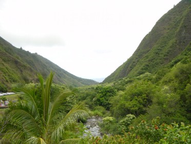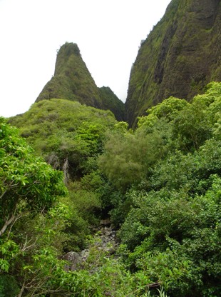 Nachdem ich eine halbe Ewigkeit im Wasser rumgepaddelt bin, dachte ich schon, das alles wieder leeres Gerede war. Aber dann habe ich ein ausgewachsenes Exemplar unmittelbar vor der Brille gehabt. Diesem Tier, das mit aller Ruhe der Welt ziellos im Wasser rumpaddelte, hin und wieder mal nach oben ging zum Luftholen, dann wieder abtauchte und sich treiben ließ, bin ich dann ungefähr ne halbe Stunde hinterher geschwommen. Es war einfach traumhaft. Eine Schildkröte hatte ich im Wasser noch nie aus der Nähe gesehen. Klasse ! Also der Ausflug hatte sich für mich voll gelohnt. Auf der Rückfahrt konnten wir noch ne halbe Sekunde ein paar Delfine neben dem Boot sehen. Leider waren sie aber sofort wieder weg. Keine Lust zu spielen. Nach dem Auschecken war es früher Nachmittag (so gegen 2 Uhr). Da wir jetzt schon einmal auf der Westkante waren, sind wir auf dem Rückweg noch ins Iao Valley und zur Iao Needle gefahren. Auch hier kommt man sich vor, wie mitten in grüner Hölle. Alles schön satt grün. Sogar die Berge und diese Needle selbst sind komplett grün bewachsen. Vom Parkplatz aus führt ein Rundweg durchs Grüne. Alles in allem recht nett hier.