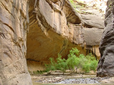 Der Weg runter war kein Problem, nur die Knie quittierten das ganze bergrunter gehen mit ein paar Klagen. Mit dem Bus ging's dann weiter bis zum Ende des Canyon Drive. Zum Temple of Sinawava. Von hier aus geht ein Fußweg weiter zu den Narrows. Die Narrows ist ein Canyon durch den man, niedrigen Wasserstand vorausgesetzt, durch den Fluss wandern kann. Da das Wasser nicht sehr kalt war und der Wasserstand maximal Knie und Oberschenkel erreichte, haben wir uns aufgemacht ein wenig in diesen Canyon hinein zu wandern. Wenn man mal ein wenig weiter geht, werden auch die Leute immer weniger. Die meisten drehten nach einer kurzen Strecke um. Irgendwann hatten wir den Canyon dann fast für uns alleine. Es war sehr interessant und ein schöner Weg. Wasserkühlung inklusive. Nach ner ganzen Zeit, ich schätze mal 2 Stunden, haben wir unsere letzten Vorräte verputzt und uns entschlossen umzudrehen. Wären wir noch weiter gegangen (was problemlos möglich ist, die Narrows sind etliche Kilometer lang), wäre es auf dem Rückweg schon dunkel geworden. Und das wollten wir vermeiden. Es war schon bei Tageslicht schwer genug in dem Fluss nicht hinzufallen.