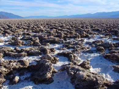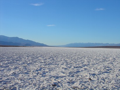 Wir wollten ins Tal des Todes. Von Vegas aus geht es in immer einsamer werdenden Landschaften zum Death Valley. Wir wollten eigentlich von Death Valley Junction auf der Straße 190 in Tal fahren. Leider war ein paar Wochen vorher eine recht verheerende Flutwelle durchs Tal getobt. Ja, richtig : Flutwelle. Am trockensten Punkt den man finden kann gab's ne fette Flutwelle. Uns zwar so heftig, das alle Straßen hinterher ziemlich weg waren. Wir konnten auch nicht mehr weiter, da die 190 ins Tal von der Junction aus gesperrt war. So blieb uns nichts anderes übrig, als weiter ums Tal herum bis hoch nach Beatty zu fahren. Von dort aus gibt's über die Straße 58 Zufahrt ins Tal. In Las Vegas war es schon recht kuschelig warm. Aber ab der Einfahrt ins Tal wurde es noch wärmer. Obwohl wir einen "normalen" Tag hatten (also nicht extra heiß), wurde es doch recht schnell sehr heiß und jeder Ausstieg aus dem Auto war wie ein Schritt in die Sahara. Wir haben zwischendurch ein paar mal angehalten und sind einfach mal ein paar Meter ins Nichts gewandert. Echt. Weite Ebenen mit "Nichts" ! Ein Abstecher zum Salt Creek führte auch nur zu recht viel staubtrockenen Schlamm :-) Leider waren auch etliche Punkte im Tal, die auch unser Reiseführer sehr gelobt hat, nicht anfahrbar. Was man fahren konnte war die Straße nach Badwater. Dort am Badwater Basin war jedoch auch Schluss. Weiter gings auch nicht. Zumindest konnte man auf dieser Strecke zum Devils Golf Course abbiegen. Beeindruckend. Bis zum Horizont bizarre Salzgebilde auf der einen und riesige Salzpfannen auf der anderen Seite. Dies zusammen mit der unglaublichen Hitze (leider hatte unsere Standardnormalkarre keine Temperaturanzeige an Bord) ergab schon die einhellige Meinung : Hier möchte ich nicht ausgesetzt werden. Weiter am Badwater Basin ein ähnliches Bild. Weite Ebene, die eher salzig weiß aussah. Ein Tümpel mit giftigem Wasser und das alles 84 Meter unter Null ! Geht es eigentlich irgendwo auf der Welt weiter runter ohne ein Loch zu graben ? Auf dem Rückweg (Straße war ab Badwater gesperrt) haben wir noch am Golden Canyon angehalten. Dieser Canyon bietet beim Durchwandern eine, wie der Name schon sagt, schöne goldfarbene Schlucht. Wir haben es noch ein wenig ausgehalten. Aber da wir auch nicht genau wussten, wie weit die Schlucht denn überhaupt geht, haben wir die Sache nach ca. 45 Minuten abgebrochen und sind zurück gegangen.
