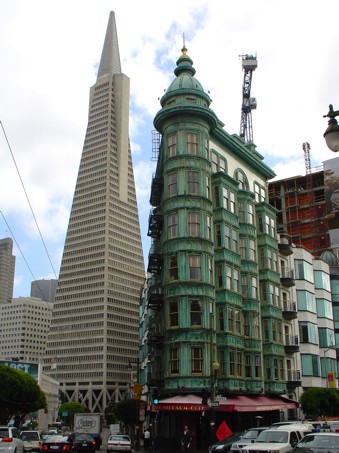 Nun gut. Zurück zur Fahrt. Ich glaube, erster erreichbarer Interstate oder Freeway war die 99. Die Nummern danach weiß ich nicht mehr. Wir sind über Oakland reingekommen und haben dann über die Baybridge das Stadtgebiet geentert. Von der Fahrt weiß ich nur noch, das kurz vor dem Stadtgebiet bei der Fahrt durch sehr unbesiedeltes und sehr hügeliges Gelände dort alles mit Windrädern vollgepflastert war. Dicht an dicht standen die Windräder entlang der Straße. Aber alles nur so kleine Dinger, nicht so Errungenschaften der Technik die wir hier so auf dem Land haben :-) Direkt nach der Bridge sind wir ins Zentrum abgefahren und haben uns auf die Suche nach unserem Hotel begeben. Das Hotel Carlton in der Sutter Streeet hatten wir am Abend vorher in Lee Vining übers Internet gebucht. Wir haben das billigste genommen, was auf dem Bild gerade nicht mehr schäbig aussah. Wir sind pro Nacht bei 70 Dollar rausgekommen, was ich für SF noch annehmbar fand. Außerdem entpuppte sich das Carlton als echte Perle. Und, das kann man gar nicht oft genug betonen, es war das einzigste Hotel des ganzen Urlaubs wo auf dem Zimmer ein Netzwerkkabel lag, über das man kostenlos und unbegrenzt lange mit Highspeed ins Internet konnte ! Zuerst sind wir ziemlich rumgekurvt, haben es aber dann von unten (von Fishermans Wharf) aus systematisch angehen lassen. Nachdem die halbe Stadt blockweise abgegrast war, hatten wir auch die Sutter Street gefunden und dazu unser Carlton. Parken konnten wir nebenan im Parkhaus für 20 Dollar am Tag.
