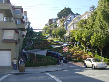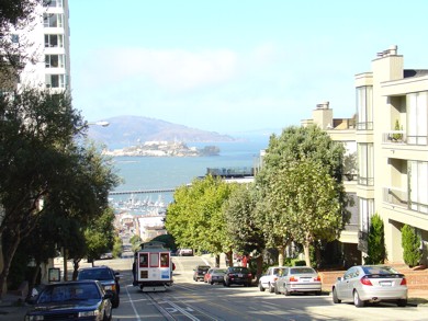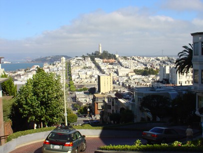 Zuerst haben wir mal den Wäscheservice des Hauses in Anspruch genommen. So langsam gingen die Vorräte an brauchbaren Klamotten nämlich zur neige. Hätten wir zu dem Zeitpunkt gewusst, das nebenan ein Chinamann mit seiner Reinigung alles für einen Bruchteil des Geldes machte, hätten wir viel Geld gespart. Naja. Hinterher ist man immer klüger. Vor die Wahl gestellt, die Stadt heute mit Auto oder zu Fuß zu erkunden, habe ich gerne die Autoversion gewählt. In San Francisco gibt es so etwas wie eine ausgeschilderte Sightseeing-Strecke, die kreuz und quer durch die Stadt gezogen alle wichtigen Punkt abgrast. Wir haben uns beim ersten sichtbaren Schild auf diese Strecke begeben und sind zuerst bei der Lombard Street und dem berühmten Zickzack-den-Berg-runter - Stück angehalten. Wunderbar. Ich kann jetzt gar nicht aufzählen, in welchen Filmen man dieses Stück schon gesehen hat. Nächster Halt ein Stück am Wasser mit wunderbarem Blick auf Alcatraz. Da wollten wir ja morgen noch hin. Das Ticket hatte ich schon von Deutschland aus übers Internet gebucht. Auch wenn wir neu in der Stadt waren. Wir wussten schon so viel, das man von hier linker Hand eigentlich die Golden Gate Bridge gesehen hätte. Aber irgendwer hatte die Brücke geklaut. Könnte auch sein, das jemand extra viel Nebel dort abgelegt hatte. Auf alle Fälle gabs da erst mal keine Brücke. Wir wollten der Sache später noch auf den Grund gehen. Weiter ging's zum Coit Tower, dem Turm (Leuchtturm glaube ich) oben auf einem Hügel inmitten einem schönen Stadtviertel mit kleinen Häuschen, die teilweise abenteuerlich schräg an die steilen Straßen gebaut sind. Dieser Turm ist auch in unzähligen Filmen schon Darsteller gewesen. Also einen Drity Harry Film kann ich direkt nennen. Natürlich haben wir mal gestoppt und uns eine Cable Car in Aktion angesehen, Hier war uns schon aufgefallen, das alle Cable Cars ausnahmslos proppenvoll waren. Weiter ging die Schnitzeljagd durch die Stadt zu einem schönen Park mit einer ziemlich fetten Rotunde im römischen Stil. Nebenan war auch ein Museum. Irgendwas mit "modern science" oder sowas. Von hier war's nicht mehr weit zum Presidio (auch hier wieder Filmkulissen gucken). Im Presidio ist aber heute keine Armee mehr. Alles macht einen etwas verlassenen Eindruck. Ein Stück weiter kann man abfahren direkt zum Fuß der Golden Gate. Von hier konnte man auch endlich ein wenig der Brücke sehen. Die Wolken hingen wirklich so niedrig, das man sogar von hier aus nicht die andere Seite der Brücke sehen konnte. Man konnte nur vermuten wo der andere Pfeiler irgendwo im Nebel war.