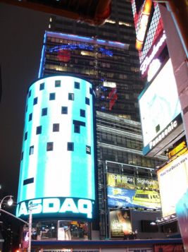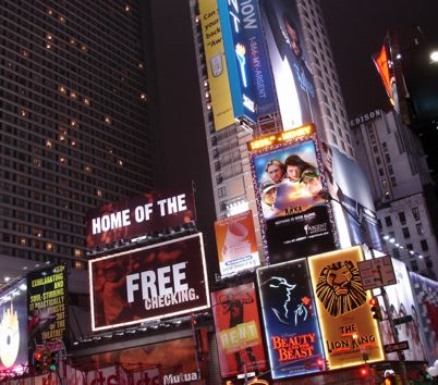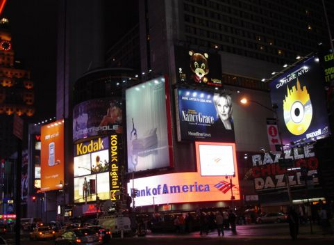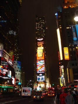 Das wir einen sog. Express-Zug erwischt hatten, wurde uns schnell klar. Diese Kiste hielt nur an den Station, wo ein Umsteigen in andere Linien möglich war. So sind wir bei einer solchen Station raus und in eine Linie, die zum Rockefeller-Center fuhr. Das war auch so ein Express-Train, aber an der Rockefeller-Station hat auch der gehalten. Wie man die Express- von den Local-Trains unterscheidet, hatten wir zu diesem Zeitpunkt noch nicht herausgefunden. An der 50. Straße ans Tageslicht gekommen, brauchten wir nur einmal um die Ecke zur 49. Straße zugehen und waren dann schnell im Hotel. Das war ja mal wirklich einfach. Einchecken und Bezug des Zimmers war auch easy. Das Zimmer war OK, hatte sogar ne Küchenecke mit Kühlschrank und Ofen. So um 20 Uhr sind wir dann wieder auf die Straße um noch ein wenig die Gegend zu erkunden. Wetter war ein wenig feucht. Es war in den höheren Regionen ein wenig neblig und es war stellenweise fein am nieseln. Der Vorteil unseres Hotels offenbarte sich sehr schnell. Einmal um die Ecke und ca. 500 Meter gelaufen stand man mitten auf dem Times Square. Und das war auch der erste Augenöffner des Abends.