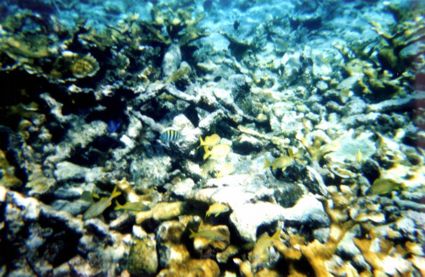 Dort gabs auch viele Fische in allen möglichen Farben. Sehr viele gabs von einer schwarz-gelb gestreiften Sorte (ohne jetzt politisch werden zu wollen :-) ). Hier hats mir eigentlich ganz gut gefallen, man hatte seine Ruhe und konnte lange genug friedlich in der Gegend rumtreiben. Den zweiten Schnorchelausflug habe ich nach Paradise Cove zum Deadmans Reef gemacht. Da waren wir ja auf unserer Autotour schon vorbei gekommen. Allerdings hatte ich da kein Badezeug dabei und wir hatten auch nicht alle Zeit der Welt. Da es mir dort aber schon vom Ambiente her sehr gut gefallen hatte, haben wir vom Hotel aus ne Tour dorthin gebucht. Bustransport, Equipment so lange man wollte und noch was zu essen für insgesamt 30 Dollar, da will ich jetzt mal nicht meckern. Das Schnorcheln dort geht direkt von Strand aus los. Das Riff ist unterteilt in niedrig und tief. Der Niedrigteil ist alles vom Strand aus bis zu den Felsen, die aus dem Wasser schauen. Der tiefe Teil beginnt dann dahinter. Stephan war beim ersten Besuch im tiefen Bereich geschnorchelt, das soll sehr toll gewesen sein. Sehr viele Fische (auch sehr große).