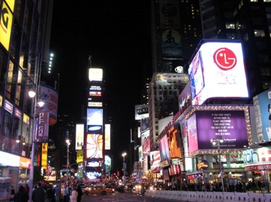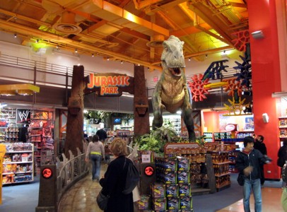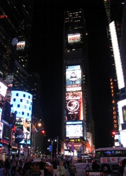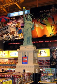 Nachdem wir uns dann noch kurz ein wenig verschnauft hatten, wars dann auch schon ungefähr 8 Uhr. Also eine Ankunft in New York mit dem ganzen Einreisekram und der anschließenden "Anreise" nach Manhattan ist zeitlich nicht zu unterschätzen. Da gehen immer irgendwie Stunden bei drauf. Unser Flug ist gegen 16 Uhr gelandet und jetzt wars schon 20 Uhr ohne das wir groß was getan hätten außer das Hotel zu suchen und einzuchecken. Von der Hotellobby aus konnte man schon fast die Lichter des Times Square sehen. Es war ja nur 3 Straßen oder so entfernt. Man brauchte sich auch nur am Lichtschein zu orientieren und schon war man da. Also haben wir einen Rundblick über den Times Square genossen und waren auch schon wieder voll drin im New Yorker Getümmel. Mehrspurige Straßen auf denen auf jeder Spur gehupt und gedrängelt wird und Massen von Fußgängern die da noch zwischendrin umherwuseln. Erste Station war der große Toys 'R Us Laden mit eingebautem Riesenrad. Nein damit sind wir nicht gefahren. Aber die anderen Auslagen waren nicht minder spektakulär. Ein lebensgroßer T-Rex in der Jurassic Park Abteilung und ein riesiger Captain Jack Sparrow und eine riesige Freiheitsstatue in der Legoabteilung. Bei den großen Laserschwertern aus der Star Wars Supersammlung wär ich ja fast schwach geworden :-)