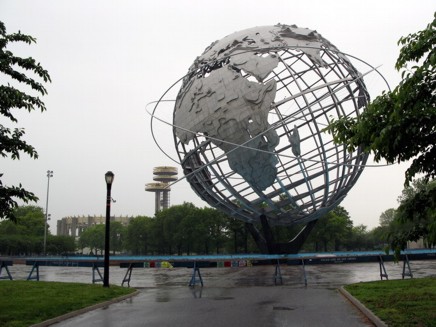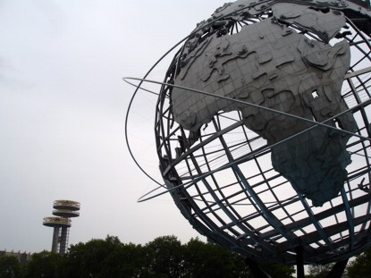 Heute war dann der Regen da, der gestern eigentlich schon hätte sein sollen. Schon am Morgen beim Blick aus dem Fenster wars grau, zugehangen und feucht von oben. So haben wir uns mit Jacke und Schirm ausgerüstet und sind los. Die eine Hälfte des Teams hat dann schon am Times Square schlapp gemacht. Die wollten sich trocken legen und was anderes machen. So sind wir zu zweit weiter. Erstes Ziel für heute war Queens. Besser gesagt erst mal der Flushing Meadows Park. Interessanterweise ist dieser Park von der flächenmäßigen Ausdehnung großer als der Central Park. Wir also in die UBahn rein und gefahren ... und gefahren und gefahren. War ne recht weite Tour. Leider regnete es so ziemlich jede Haltestelle stärker (die UBahn war die letzten paar Haltestellen als Hochbahn ausgeführt) und bei unserem Halt war vollends am schütten.