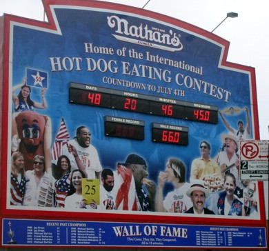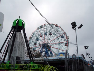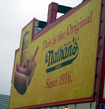 Und was soll ich sagen. Die Sachen hier waren ja soooo lecker ! Wir haben schließlich diverse Dollar investiert und als wir die ganzen Kaffees getrunken hatten und Teilchen verputzt hatten, hatte es sogar mal aufgehört zu regnen. Wir sind noch den Rest durch Corona gegangen und haben uns dann wieder zu einer Bahnstation orientiert. Corona war anscheinend komplett in spanischer Hand. Ich vermute mal, nur mit englisch steht man hier auf verlorenen Posten. Die Bahnstation konnte man auch nicht verfehlen. Man musste ab einem gewissen Punkt nur der vorrosteten und verkommenen Hochbahn nachlaufen. Die geht hier mitten durchs Viertel. An beiden Seiten mit ca. einem Meter Abstand an den Häusern vorbei. Also echt ein absolut schäbiger Anblick. Und auch wieder ein ohrenbetäubender Lärm. Rumpel, Ratter, Quietsch. Also ich fasse es einfach nicht, wie man hier wohnen kann. Mit der Bahn ging es dann von hier mit einmal Umsteigen nach Coney Island. Wir sind von hier oben fast ne Stunde gefahren und als wir endlich da waren, wars auch wieder feste am schütten. So ziemlich das erste was man sieht, wenn man die Bahnstation verlässt ist Nathans. Nathan's Famous, wie der Laden richtig heißt, ist ein alteingesessener Hot Dog Laden, der die Würste schon seit 1916 hier verkauft. Jedes Jahr am 4. Juli wird hier auch ein großes Hot Dog Wettessen mit internationalen Teilnehmern veranstaltet. Wir haben natürlich auch mal die verschiedenen Hot Dogs durchprobiert. Lecker ja, aber soooo was Besonderes wie alle tun wars nicht. Und 66 Stück wie der Gewinner des letzten Wettessens verschlungen hat, haben wir nicht annährend geschafft :-)
