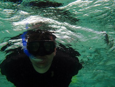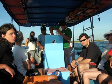 Wenn man nah am Kopf war, konnte man auch sehen, wie riesig die ganze Schädelpartie und das Maul sind. Unglaublich. Wir haben dann den großen irgendwann in Ruhe gelassen und sind weiter gefahren. Der Ausguck hat dann noch einen anderen gefunden. Der war nach Aussage des Kapitäns aber eher ein Babyhai. Schätze mal so drei Meter oder so. Der ließ sich auch nicht so bereitwillig verfolgen. Er hat sich immer schnell abgesetzt. Ich bin hier auch noch einmal ins Wasser, habe aber nur noch die Verfolgereskorte, die den Fisch die ganze Zeit begleitet (alle möglichen Fische) gesehen. Es gab auch keine Chance mehr ihn einzuholen, dafür war er zu schnell. Nachdem dann irgendwann jeder genug Walhai gesehen hatte und keiner mehr Lust hatte ins Wasser zu springen, hat sich der Kapitän auf den Rückweg gemacht. Wir haben zwischendurch an einem Riff noch einmal gestoppt. Der Kapitän musste nachtanken (hat natürlich der Junge wieder alles gemacht, inklusive das Ansaugen des Benzinschlauches) und wir konnten am Riff noch ne Zeit lang Schnorcheln. Ein paar Sandwichs gabs dann anschließend auch noch. Zurück gings nach Punta Sam und mit dem Bus wieder zum Hotel, wo wir so gegen 3 oder 4 Uhr (genau weiß ichs nicht mehr) eingetroffen sind.