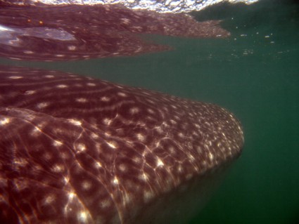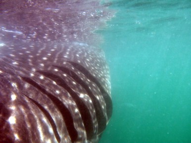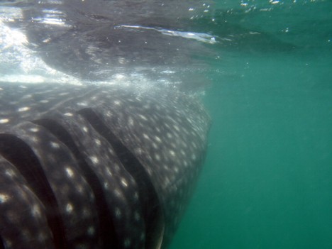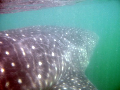 So nach ungefähr 45 Minuten angestrengtem Wasser anstarren dann der erlösende Ruf von Ausguck. Da war einer. Zwischendurch hatte es schon mal nen Fehlalarm gegeben. Da war es "nur" ein riesiger Rochen, der an der Wasseroberfläche rumpaddelte. Aber diesmal wars ein Walhai. Und ein recht großes, kapitales Gefährt obendrein. So die ausgewachsene 10 bis 12 Meter Klasse. Schon alleine die Ausmaße des Fisches die man durch die Wasseroberfläche vom Boot aus sehen konnte waren unglaublich. Und dann ging es los. Es wurden immer zwei Leute zusammen mit dem "Guide" (den Posten hat der Bootsjunge übernommen) und der Filmfrau ins Wasser gelassen. Man durfte dann bis ganz nah an das Tier dran (Anfassen verboten) und musste eigentlich nur zusehen, das man das Tempo mithalten konnte. Von draußen sah das ziemlich gemütlich aus, aber im Wasser musste man sich schon recht gut anstrengen um mit dem Vieh mitzuhalten. Der Walhai hat sich übrigens von dem ganzen Trubel nicht wirklich aus der Ruhe bringen lassen. Der hat gemütlich weiter seine Bahnen geschoben und das, was immer er aus dem Wasser filtert, aus dem Wasser gefiltert. Wenn ihm die Sache an einer Stelle zu dumm wurde, hat er mal kurz mit der riesigen Schwanzflosse gezuckt und war direkt 10 Meter weit weg. Wenn dann nun die zwei oder drei Leutchen im Wasser waren ist das Boot weiter voraus gefahren um dort neue Leute abzusetzen und dann später zurückgekommen um die vorige Gruppe wieder aufzunehmen. So ging das Spiel etliche Male. Ich habe insgesamt viermal die Sache mitgemacht. Beim ersten Mal war es nicht so ideal. Als ich im Wasser war, habe ich eigentlich nur etwas riesiges unter mir wegtauchen gesehen und eine riesige Schwanzflosse zu Gesicht bekommen. Mehr war nicht. Doch bei den Versuchen zwei und drei konnte ich recht lange in Kopfhöhe mit dem Tier mitschwimmen und alles genau sehen. Leider sind die Bilder nicht so toll geworden. Sie können es nicht so spektakulär wiedergeben wie es in Wirklichkeit war.