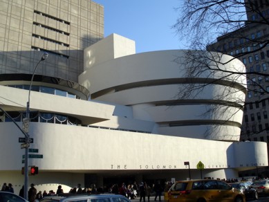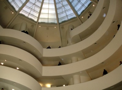 Insgesamt wars im Park ganz wunderbar ruhig und die Durchquerung fand ich sehr entspannend. Es war auch recht viel los. Überall waren Gruppen von Leuten, die irgendwas machten oder sich um irgendeinem Künstler der sonstwas machte herum eingefunden hatten. Ach ich hab ja noch garnix übers Wetter erzählt. Ich hätte gedacht es wäre kälter. Eigentlich wars ein sehr netter Wintertag mit noch recht angenehmen Temperaturen so um 9 bis 10 Grad. Wind ging auch nicht, so das einem das auch nicht so kühl vorkam. Ich bin dann auf der anderen Seite des Parks hochgegangen. Am Museum of Modern Art vorbei ( da war gerade Samurai-Ausstellung ) weiter hoch bis zum Guggenheim Museum. Man das war doch ne recht lange Strecke. Hätte ich nicht gedacht. Auf der Karte wars nicht so weit, aber gelatscht bin ich doch gefühlte 20 Blocks. Ins Guggenheim wollte ich schon länger mal rein. Hat man ja auch schon in vielen Filmen gesehen. Sieht das Gebäude schon von außen recht interessant aus, so setzt sich das von drinnen noch weiter fort. Dieser „Wendel-Wandel-Gang“ von unten nach oben sieht schon sehr interessant aus. Gedacht ist es, das man zuerst mit dem Aufzug ganz hoch fährt und dann langsam von oben nach unten „runterwandelt“ und sich von der Kunst … äääh … beeindrucken lässt.