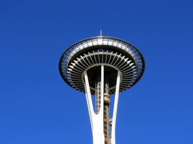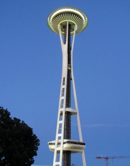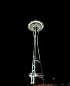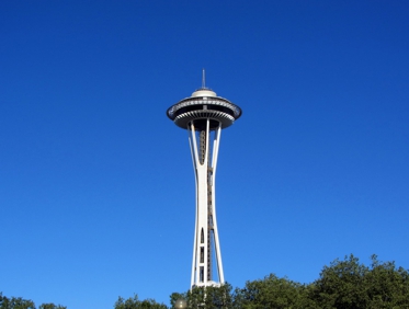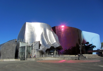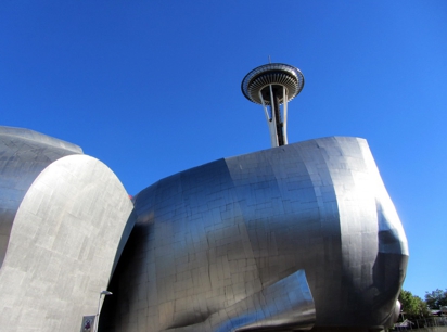 Checkin im Marqueen Hotel war easy mit einem netten Plausch mit der Frau von der Rezeption und dem Concierge inklusive. Ich bekam die Wahl zwischen nem Zimmer im Erdgeschoss oder in der dritten Etage mit dem dezenten Hinweis darauf, das es ja keinen Aufzug gäbe. Da habe ich doch direkt mal Erdgeschoss gewählt. Das Hotel hat eindeutig schon bessere Zeiten erlebt. Es sah schon alles recht alt aus. Was muss eigentlich erfüllt sein, das sich ein Hotel „Boutique Hotel“ nennen darf ? Muss es einfach alt sein und als Antiquität durchgehen ? Ich habe mich fast nicht getraut im Zimmer hin und her zu gehen, so laut und kreischend knarzte das Parkett. Das hat man bestimmt noch auf der anderen Straßenseite gehört. Letztendlich wars aber jetzt nicht schlimm. Das Bett war groß und weich, Zimmer recht groß, mit Sitzecke und Küche dran. Ich würde es nicht schlecht bewerten, überschwänglich empfehlen aber auch nicht unbedingt. Die Lage war aber garnicht so schlecht. Ein ganz kurzer Erkundungsgang förderte Pubs, Restaurants, Cafes und nen 24-Stunden-Getränkeladen (an dem in den nächsten Tagen zu jeder beliebigen Tages- und Nachtzeit immer der gleiche Chinese an der Kasse stand) zu Tage. Also verhungern und verdursten kann man hier oben echt nicht. Der erste Gang jetzt am späten Nachmittag führte mich zur Space Needle. Die Stand wie ein unübersehbarer Wegweiser direkt vor meiner Nase und da musste ich einfach hin. Is schon ein ziemlich schönes Ding dieser Turm. Und wenn man bedenkt das der schon 1962 gebaut wurde, dann Respekt (meinlieberherrgesangsverein). Auf dem ganzen Gelände rundherum habe ich mich mal umgesehen und Science Center, Glas-Skulpturengarten, großen Brunnen (ui was ne Platzverschwendung) abgeklappert. Natürlich war jetzt am Nachmittag alles schon zu (Science Center und Glasgarten) aber ich hätte auch nicht gewusst, ob ich da wirklich den Eintritt bezahlen wollte. Das EMP Museum habe ich noch genauer begutachtet. Das sieht mit seiner mehrfarbigen wild geschwungenen Metallhaut ja irgendwie aus wie das Guggenheim Museum in Bilbao.