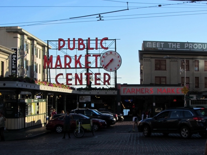 Der Reiseführer erzählte mir dann das dieses EMP-Ding (EMP = Experience Music Project) im Wesentlichen eine Hommage an Jimi Hendrix und Kurt Cobain sei, erweitert um ein paar zusätzliche (wechselnde) Ausstellungen. Erstaunt war ich zu lesen das der alte Jimi gebürtiger Seatt-ler war. Wenn mich einer als Telefonjoker bei Günter Jauch angerufen hätte, dann hätte ich felsenfest behauptet das er Engländer war. So kann man sich irren. So irgendwie halb durch das Gebäude durch fährt eine Einschienenbahn. Die stammt auch aus der Weltausstellungszeit von 62 und war damals wohl der Zeit so weit voraus, das das Ding von allen verspottet wurde. Und heute siehts irgendwie rührend nostalgisch aus. Mit dieser Bahn kann man von der Space Needle aus nach Downtown 5te Straße/Pine Street fahren und kommt in einem der oberen Stockwerke des Westlake Center raus. Eben diese Pine Street bin ich mit kleineren Abstechern zur Seite ein wenig hoch marschiert bis ungefähr 9te Straße zum Paramount Theatre. Hier bin ich nach rechts abgebogen und einen Block weiter auf der Pike Street wieder runter. Hier oben in dem Komplex aus Hyatt, Sheraton und Convention Center ist sogar die Straße feudal überdacht. Laut Reiseführer sollten gerade an der Pike/Pine Linie viele Restaurants und Kneipen sein. Ich habe da zwar das eine oder andere gesehen, aber man konnte das jetzt nicht unbedingt eine signifikante Anhäufung nennen. Hier auf der Pine geht’s noch an diversen großen Flagship Stores vorbei. Bei Nike bin ich noch hängen geblieben. Aber irgendwie hat mich da die Auswahl an Schuhen oder schönen Shirts nicht aus den Latschen gehauen. Bei den Urban Outfitters bin ich noch rein. Mein Eindruck verfestigte sich, das die Klamotten von denen für eine andere Zielgruppe gemacht sind. Garantiert aber nicht für mich. Und bei American Eagle gabs im Laden genauso wie in Boston nix über L zu kaufen. Damit war dann auch mein Shoppingdrang ausgiebig gesättigt. Weiter die Pike runter läuft man ohne was dafür zu tun schnurstracks auf den Pike Place Market zu und kommt nebenbei auch beim Hard Rock Cafe vorbei. Jetzt am Abend war am Market natürlich nix mehr los, daher habe ich nur kurz mal reingeschaut und die Pike Brewing Company gecheckt. Aber irgendwie hatte ich heute eindeutig keine Lust auf Pubfood. Also bin ich schnell wieder weg.