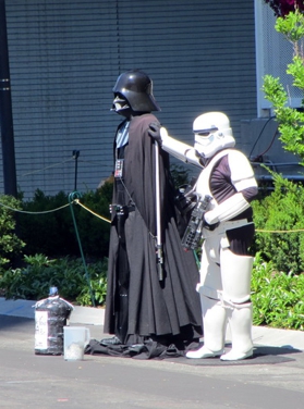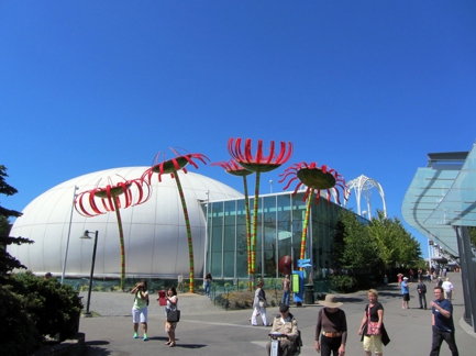 Bei der Needle musste ich dann erst mal ein wenig Zeit totschlagen. Die Tickets für nach oben sind in Zeitslots eingeteilt. Und wenn man 12 Uhr auf seiner Karte stehen hat, dann darf man auch erst mit der 11 Uhr 30 Anstell-Meute rein. In den Glasgarten hätte ich noch reingehen können. Als ich aber gelesen habe das die da noch richtig Eintritt haben wollten hab ichs sein lassen und kostengünstig ein paar Bilder von draußen über den Zaun geschossen. Den original Blockföten-Fußgängerzonen-Peruanern habe ich noch zu gehört (ich sag nur El Condor Pasa) und ner Darth Vader und Sturmtruppenfigur zugeguckt. Dann durfte ich mich auch endlich anstellen.