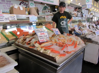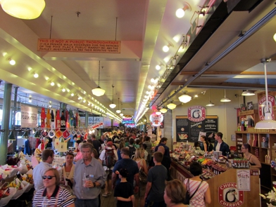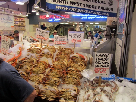 So richtig umgehauen hat mich das alles irgendwie nicht. Entsprechend schnell war ich auch wieder draußen. Also von mir aus gibt’s jetzt keine unbedingte Geheimtippempfehlung für dieses EMP Museum. Mit der Monorail gings dann wieder nach Downtown und zu Fuß weiter zum Pike Place Market. Den Markt bin ich dann von seinem linken Ende bis zum anderen Ende einmal abmarschiert. Unglaublich viele Leute, unglaublich viel Fisch und Krabben und Shrimp-Zeugs, zwischendurch noch Obst und Blumen. Ein Markt halt. Warum da jetzt so ein Aufhebens drum gemacht wird konnte ich nicht wirklich erkennen.