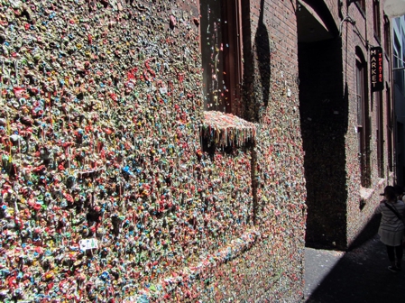 Irgendwo auf der Hälfte der Hallen kann man in eine kleine Gasse abzweigen. Ich bin da eigentlich nur zufällig rein, weil das das einzige war, wo man sich weiter runter zum Wasser hin begeben konnte. Auf jeden Fall kommt man in dieser kleinen Gasse an einer recht eigenartigen Seattler Attraktion vorbei. Der Gum Wall. Eine Hausfront dick zugeklebt mit Kaugummis aller Art. Es war zur selben Zeit interessant kurios und ekelig zugleich. Jeder der hier vorbei kommt ist aufgerufen seinen Gummi hier anzukleben. Augenscheinlich war die Schicht auf der Mauer schon ziemlich dick. Jetzt so im Nachgang drüber nachgedacht wars dann aber doch eher mehr ekelig als kurios. Auf verschlungenem Wege über ein paar Treppen und Hinterhofparkplätze kommt man von hier auch runter ans Wasser. Diese Hochstraße die da rumsteht stört irgendwie. Aber da gibt es Pläne für ein umfangreiches „Remodeling Program“ das diesen "Alaskan Way Viaduct" komplett in die Erde verlegen will.