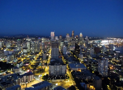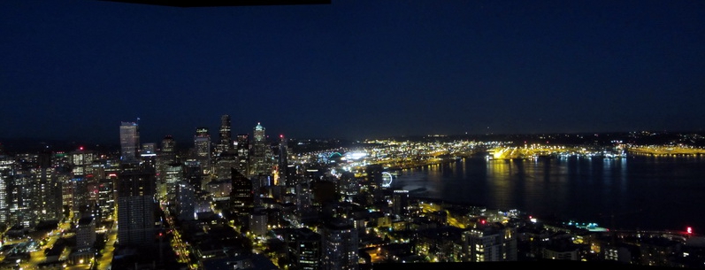 Irgendwann nach laaangem Gehen bin ich dann auch wieder beim Westlake Center rausgekommen und habe mit nur minimalen Schwierigkeiten die Monorailstation gefunden. Mit der Monorail gings zurück zur Spaceneedle. Ich hatte das Komboticket gekauft welches mich noch für einen Eintritt bei Dunkelheit berechtigte. Wenn ich mich recht erinnere dann waren es jetzt ca. 21 Uhr und es war auch schon recht düster. Der Blick auf die beleuchtete Stadt war schön. Heute Abend war auch jemand draußen, der jeden ermahnte seine Kamera und sein Handy nicht nach draußen über das Gitter hinaus zu halten. Ich würde ja gerne mal wissen wieviele Kameras und Handys den Leuten unten schon aufn Kopf gefallen sind, wenn die oben extra jemanden haben der aufpassen muss. Am Ende habe ich mich doch noch länger oben aufgehalten, so dass es schon relativ spät war als ich beim Hotel war. So hats dann nur noch für was zu trinken und was zu knabbern beim 24-Stunden-Chinesen gereicht. Gute Nacht. „Ich bin eindeutig zu viel gelaufen heute“ ging mir nur noch kurz durch den Kopf.