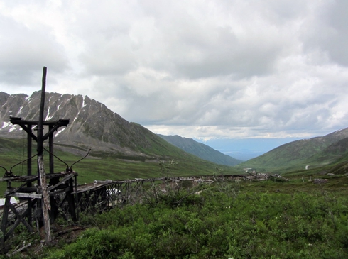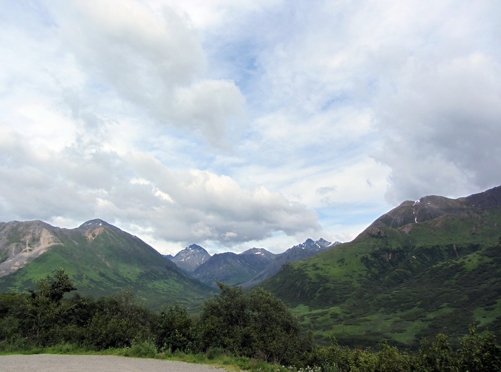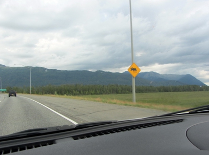Mein kleiner Nissan hatte ja eigentlich nix. Außer nem Automatikgetriebe und nem Tempomat. Das habe ich auch ausgiebig genutzt. Tempomat einstellen auf 60, Beine einfahren, gemütlich rollen und dabei die absolut geniale Landschaft ringsherum aufnehmen. Ich wäre ja fast das eine oder andere Mal rechts ran gefahren um Fotos zu machen. Leider standen aber hin und wieder Schilder da, das man gerade dies nicht machen durfte. War scheinbar verboten. So habe ich ausgiebig nur geguckt. Auf irgendeinem Abschnitt des Highway gabs tolle Elch-Warnschilder. Komplett mit Unfallbilanz-Anzeiger (im July bisher ein tödlicher Elchunfall, wobei ich eher vermute für den Elch tödlich). Der Weg zur Mine war wirklich absolut easy. Ich habe mich auch FAST garnicht verfahren. Ich wusste, das ich auf diesem Highway 1 irgendwann mal rechts abbiegen muss weil geradeaus weiter aus der Straße die Straße Nummer Drei wird. Jetzt hatte man aber böswilligerweise einen Abzweig auf den Glenn Highway ausgeschildert, aber scheinbar vergessen beizuschreiben, das es sich hierbei um den OLD Glenn Highway handelt. Grrr. Schon kurz nach Abzweig habe ich festgestellt, dass die Milemarker alle wieder von 0 an hochzählten. Und noch 89 Meilen zu fahren, das konnte nicht richtig sein. Auf dem Rückweg zu dort wo ich eben abgebogen war, habe ich dann irgendwo auch das „Old“ gelesen. Naja. Wie gesagt. Fast garnicht verfahren. Am richtigen Milemarker 89,irgendwas angekommen ging auch wirklich ein Abzweig ab und ab hier war die Mine auch ausgeschildert. Ab hier auf der „North Palmer Fishhook Road“ habe ich dann auch mal das eine und andere Mal angehalten um die klasse Landschaft um mich herum abzulichten.