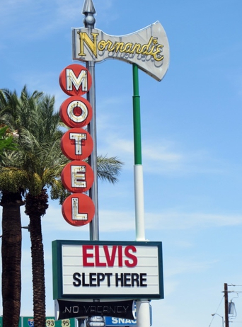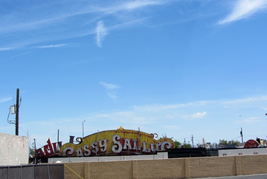 Um hinzukommen musste ich aber erst mal noch ein bisschen gehen. Vom Busstop zum Friedhof wars noch bestimmt 4 oder 5 Blocks der Straße entlang und unter der Autobahn durch. Der Eingangsbereich ist eine ehemalige Lobby eines alten Casinos, die man hier wieder aufgebaut hat. Irgendwas mit Muschel / La Concha wars. Dort angekommen konnte ich gerade noch hören wie zwei andere Leutchen verabschiedet wurden. Als die beiden weg waren, kam der Neon-Boneyard-Chef auf mich zu und offenbarte mir, das es heute keine Touren mehr geben würde. Es wäre schlicht zu heiß. Arrgh. Auch nachdem ich ihm sagte, dass ich ja schon in der Hitze den ganzen Weg hier hoch gelaufen wäre und ich ja immer noch leben würde, so schlimm wäre es schon nicht, hat er sich standhaft geweigert, noch eine Tour zu machen. Schade. Ein wenig haben wir uns dann aber doch noch unterhalten. Ich habe ihn auf den Film angesprochen und er wurde sehr auskunftsfreudig. Am Ende entschuldigte er sich dann nochmal bei mir, das ich nun umsonst gekommen wäre und legte mir ans Herz das ich doch ins Mob Museum gehen solle. Das wäre fast da, wo der Busstop ist, und dann wäre ich schon nicht ganz umsonst hergekommen. Bevor ich dann wieder die Straße entlang und unter der Autobahn durch zurückmarschiert bin, habe ich noch versucht, von draußen einen Blick auf ein paar Neonteile zu kriegen. Fehlanzeige. Alles hinter hohen Mauern versteckt.