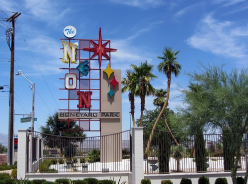 Zumindest konnte man schön die Gegend anschauen. Überraschend fand ich dabei, das es vor allem in der Gegend unten um den Stratosphere Tower zum einen viel Bautätigkeit gab, zum anderen noch diverse Flächen Brachland, die noch auf einen Bau warteten. Auf einem anderen Riesengrundstück hatte man scheinbar mal angefangen was zu bauen, was aber irgendwie aussah, als ob da irgendwelche Bauruinen ständen die nicht mehr weitergebaut werden. Letzter Stopp des Deuce Bus ist Downtown in der Kante von Stewart Ave / Las Vegas Boulevard, was jetzt die näheste Möglichkeit zu meinem ersten Tagesziel war. Ich wollte zum „Leuchtreklamenfriedhof“ dem Neon Boneyard. Diesen Neon Boneyard hatte ich schon länger auf dem Plan, erinnert daran wurde ich zuletzt noch ganz aktuell vom Film „Last Vegas“. Eine Szene spielt nämlich auch da auf dem Boneyard.