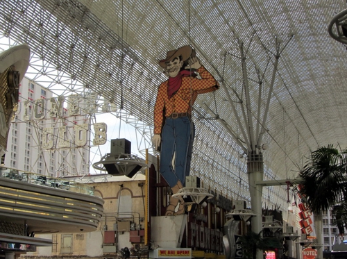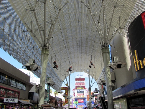 Nach dem Museum bin ich dann zur nahen Freemont Street gegangen. Der überdachte Straßenteil mit den alten Casinos wie 4 Queens und so ist schon recht interessant. Jetzt hier am Tage war aber nicht wirklich was los. So bin ich ganz bequem einmal hoch und einmal runter marschiert. Unter der Überdachung hat man mittlerweile auch so eine Zip-Line gebaut. Man kann mittels Seilbahn wie früher aufm Abenteuerspielplatz einmal von Anfang bis Ende der Straße unter dem Dach hersausen. So recht spektakulär sah das für mich ja nicht wirklich aus. Ist wohl eher ne lahme Angelegenheit. Mit dem Bus bin ich nun wieder hoch zum Strip gefahren. Eigentlich hatte ich ja geplant bis ganz hoch hinters Mandalay Bay zu fahren und mir das original Las Vegas Schild da auf dem Las Vegas Boulevard noch anzuschauen. Das kenne ich nämlich nur von Fotos, habs aber bisher noch nicht live gesehen. Als ich dann mit dem Bus irgendwann in Höhe von New York und Monte Carlo war, war mittlerweile so dermaßen viel Zeit vergangen, das mir eben diese ein wenig davon lief. Ich wollte noch was Essen und meine heutige Show fing schon um 19:30 an. Irgendwie wurde das alles ein wenig knapp. So habe ich das Las Vegas Sign kurzerhand auf den nächsten Besuch verschoben und mich nochmal zum Double Barrel begeben, um die Qualität des Ribeye nochmal zu testen. Und ich muss sagen. Auch heute wars echt gut. Sehr gutes Stück Fleisch.