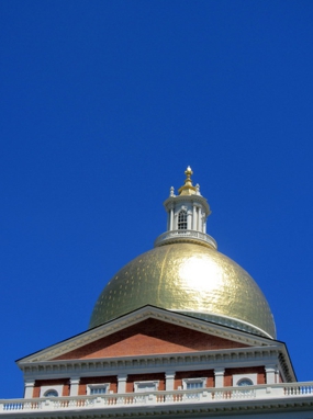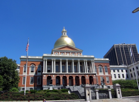Die erste Station ist das Massachusetts State House mit seiner goldenen Kuppel am Rand des Parks. Das war aber ziemlich zu. Keine Ahnung ob es generell für die Öffentlichkeit offen ist. Leider konnte man von etwas weiter aus dem Park kein vernünftiges Foto machen, weil man mitten vor das Gebäude einen riesigen Baum hingestellt hatte. Die Kuppel leuchtete in der tollen Sonne (Wetter heute übrigens absolut Sommer. Fast schon zu heiß) so hell das man fast ne Sonnenbrille brauchte. Um die Ecke ist noch eine Kirche und dahinter folgt der „Granary Burying Ground“. Seinerseits so ziemlich der älteste Friedhof in Boston wo auch ein paar sehr bekannte Namen beerdigt sind. Toll fand ich die Lage inmitten der Stadt zwischen hohen Gebäuden eingezwängt. Die windschief herumstehenden und verwitterten Grabsteine ergaben eine wirklich coole Szenerie.