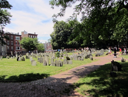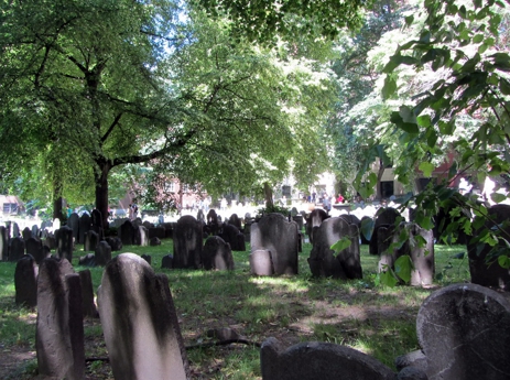 Im weiteren Verlauf kommt man noch an ein paar Kirchen, Denkmälern, Häusern (zum Beispiel Paul Revere Wohnhaus) vorbei. Nebenbei marschiert man auch durch diverse Stadtviertel. Um zum Beispiel durch zu dem Paul Revere Haus zu kommen, geht man mitten durch das italienische Viertel. Hier wurde das Straßenbild dann innerhalb von ein paar Straßenblöcken dominiert von kleinen Bars und ziemlich vielen italienischen Restaurants (viele Umbertos, Luigis und Giovannis gabs hier). Man kommt auch an der Old North Church vorbei, in deren Kirchturm der gute Herr Revere zwei Laternen aufgehängt hat um vor dem Angriff der Briten zu warnen. Hier in der Nähe ist auch noch ein alter Friedhof ebenfalls mit windschiefen verwitterten Grabplatten.